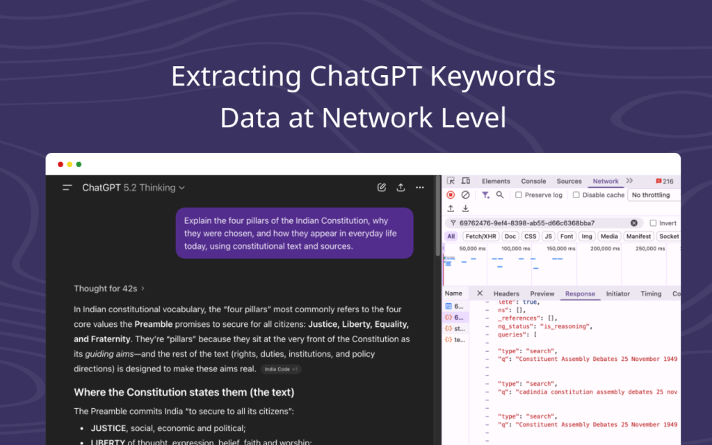 Prism sits quietly in your browser’s network layer. It uses Passive Stream Interception to grab these high-value “fan-out” keywords the exact moment the AI generates them. You get the raw, unfiltered search intent that the world’s smartest AI used to build your answer.